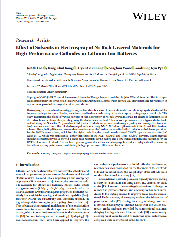 Effect of Solvents in Electrospray of Ni‐Rich Layered Materials for High‐Performance Cathodes in Lithium‐Ion Batteries관리자2025-12-05 조회 8 댓글 0이메일주소 site@site.co.kr Author JinUk Yoo, Dong Chul Kang, Hyun Chul Kang, Songhun Yoon, Sung Gyu Pyo Journal International Journal of Energy Research Year of Pub. 2025